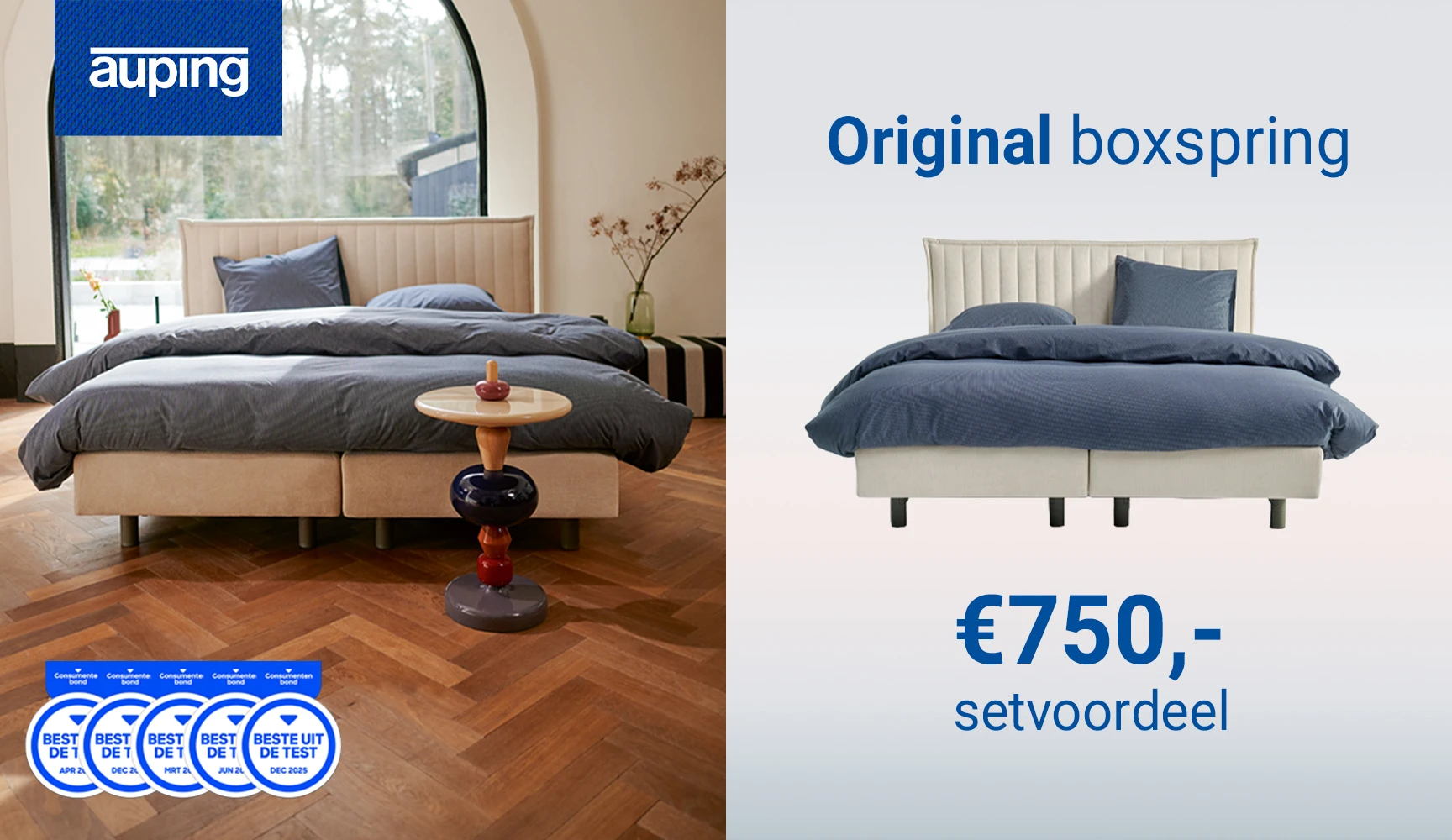 Ontvang nu €750,- setvoordeel op de Auping Original boxspring en het Auping Original bed.* Kom dus snel proefliggen in onze winkel.